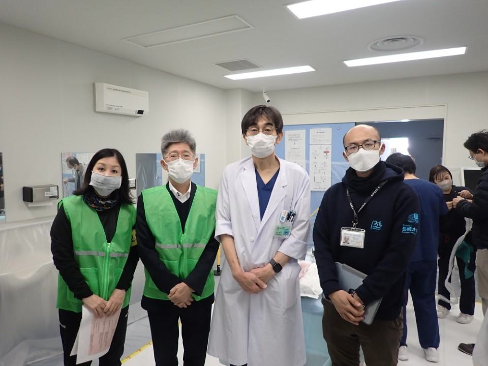 さらに本視察では、長崎大学医歯学総合研究科の吉田浩二先生と済生会川内病院の嵜山敏男院長との間で、今後の連携に向けた意見交換と、記念撮影が実施された。吉田先生は、昨年12月に本学地域防災教育研究センターが主催した「レジリエント社会・地域共創シンポジウム」にも参加されており、これまでの学術交流が現場での協働へとつながる形となった。また、嵜山院長が本学医学部の卒業生であることも、人的ネットワークを基盤とした連携の広がりを感じさせる出来事であった。