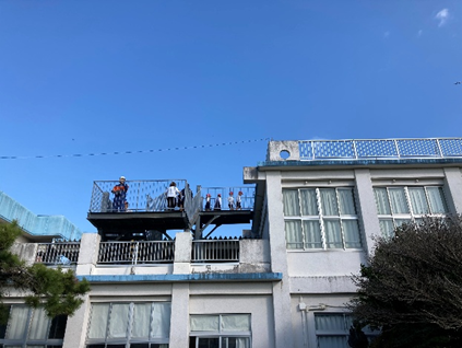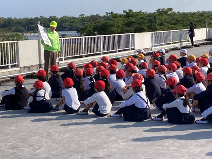 屋上では、同校の橋口大士校長から、児童に対し、避難する時には「おかしもち」(押さない、駆けない、しゃべらない、戻らない、近寄らない)を守ることや、「自分の命は自分で守る」ことを忘れないようにとの話がありました。