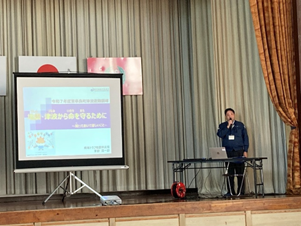訓練当日、同町の柏原小学校においては、土曜授業の中で避難訓練及び防災講話が実施され、防災講話では、鹿児島地方気象台の茅野真一郎南海トラフ地震防災官が講師を務めました。これは、当センターが本年4月に実施した地域ニーズ調査において同町から要望があり、気象台と連携して実施されたものです。