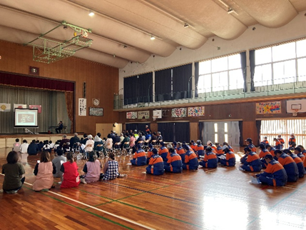 その後、同校の体育館で、「地震・津波から命を守るために~知っておいてほしいこと~」と題して茅野防災官が講話を行い、同校4~6年生の児童46名のほか、地域住民や宮原順町長をはじめ町職員・消防職員、消防団員等多くの方々が参加されました。