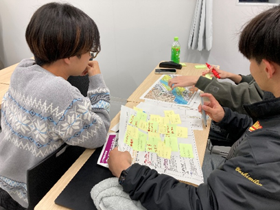 その後、グループワークが始まり、学生は3グループに分かれて、自分の居住場所は山の近くか、川の近くか、どんな建物に住んでいるか、家族構成はどうなっているかなどの条件設定を行い、ハザードマップで地域の災害リスクを把握しながら、気象台から段階的に発表される防災気象情報に応じて、どのような行動をとるべきか、どのようなルートで避難所に向かうべきかなどについて真剣に討議していました。