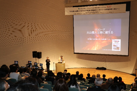 第1部では、はじめに、本センター兼務教員である井村隆介准教授(総合教育機構共通教育センター)から、「プロローグ―火山噴火災害に備える―」と題し、規模の大きな噴火では、人的な被害が多くなるだけでなく、ライフラインを含めた日常が周辺地域で失われることや、一過性が強い他の自然災害とは全く異なる対応が必要との話がありました。